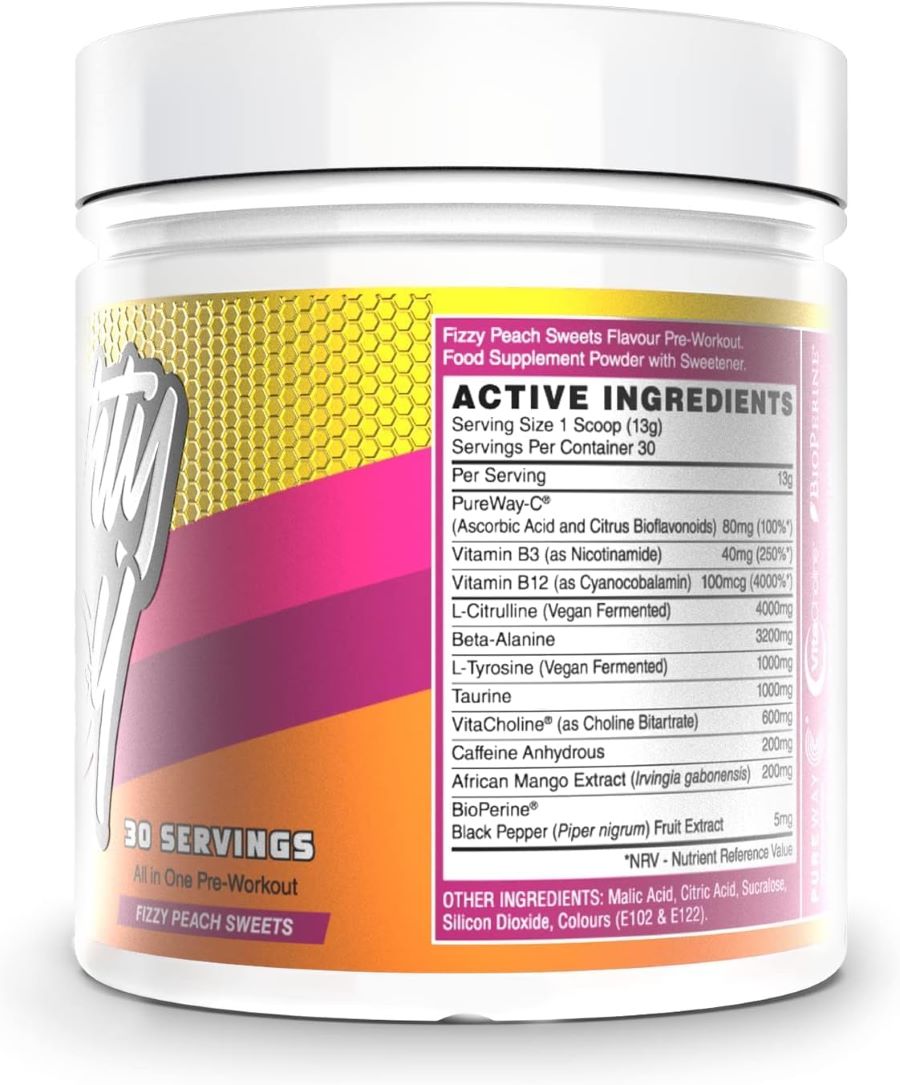 Ingrediente Naughty Boy Energy: L-Citrulină, Beta-alanină, L-Tirozină, Taurină, Vitacolină (sub formă de bitartrat de colină), Cafeină, Mango african, Vitamina C, Vitamina B3, extract de piper negru, vitamina B12, acid malic, acid citric, sucraloză, dioxid de siliciu, colorant azorbina.