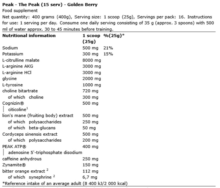 Ingrediente The Peak: Malat de L-citrulină, alfa-cetoglutarat de L-arginină (AKG), clorhidrat de L-arginină, citrat de sodiu, glicină, L-tirozină, agent antiaglomerant (sare de calciu a acidului ortofosforic), citrat de potasiu, bitartrat de colină, aromă, citicolină Cognizin®, extract de Hericium Erinaceus (fructe), extract de Cordyceps Sinensis (miceliu), adenozin 5'-trifosfat disodic (PEAK ATP®), cafeină anhidră, extract de Mangifera indica (Zynamite®) (frunze), îndulcitori (sucraloză, stevioglicozide), extract de portocală amară (fructe), coloranți (riboflavină, silicat de aluminiu și potasiu, oxid de fier, dioxid de siliciu).