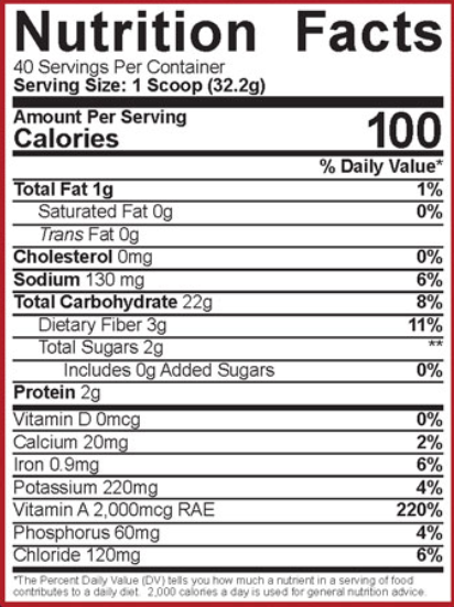 Ingrediente: Pudră de tărâțe de orez (RiBran 300), maltodextrină din tapioca (TapiOK), fulgi de ovăz, pudră de cacao, arome naturale, amestec de gumă (gumă de celuloză, gumă xantan, caragenan), clorură de sodiu, sucraloză.