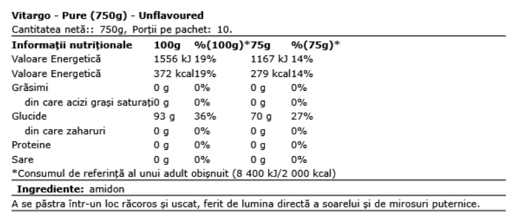 Valori nutriționale clar definite: Vitargo Pure conține aproximativ 370 kcal, aproximativ 92 g de carbohidrați și mai puțin de 0,5 g de grăsimi și mai puțin de 0,5 g de proteine. Valorile pot varia ușor în funcție de gustul dumneavoastră.